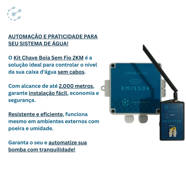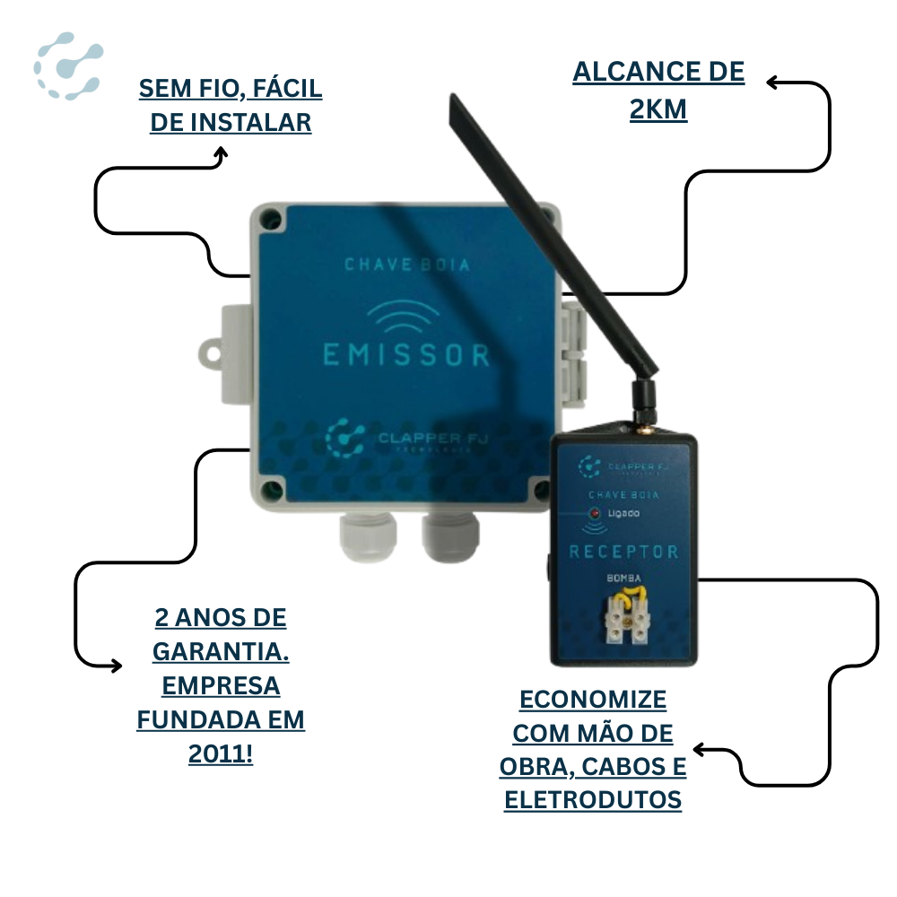 Experimente a inovação em monitoramento e controle de nível de água com o Kit Chave Boia da Clapper FJ. Este sistema foi projetado para operar sem a necessidade de cabos de energia entre o reservatório e a bomba, oferecendo uma solução econômica, rápida e segura. Ideal para uma variedade de reservatórios, o kit simplifica a instalação e reduz os custos com infraestrutura e mão de obra. Com um alcance de operação flexível entre 2 a 10 km, ele se adapta perfeitamente às necessidades de diferentes projetos.